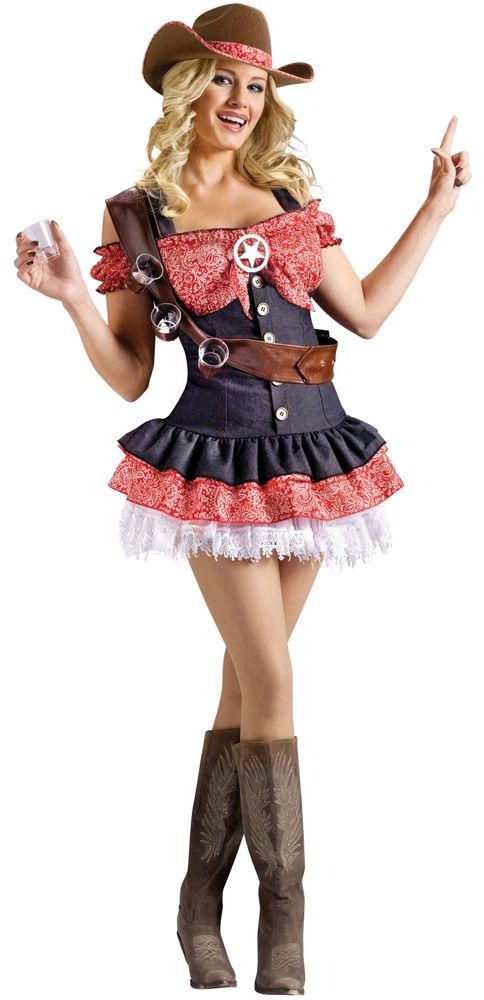 Костюм секси ковбойки включает в себя короткое милое платье, выполненное в сине-красном цвете. К платью прилагается серебряный значок в виде звезды в круге. Также имеется коричневая ковбойская шляпа с красной отделкой, патронташ коричневого цвета и три полупрозрачные рюмочки.
