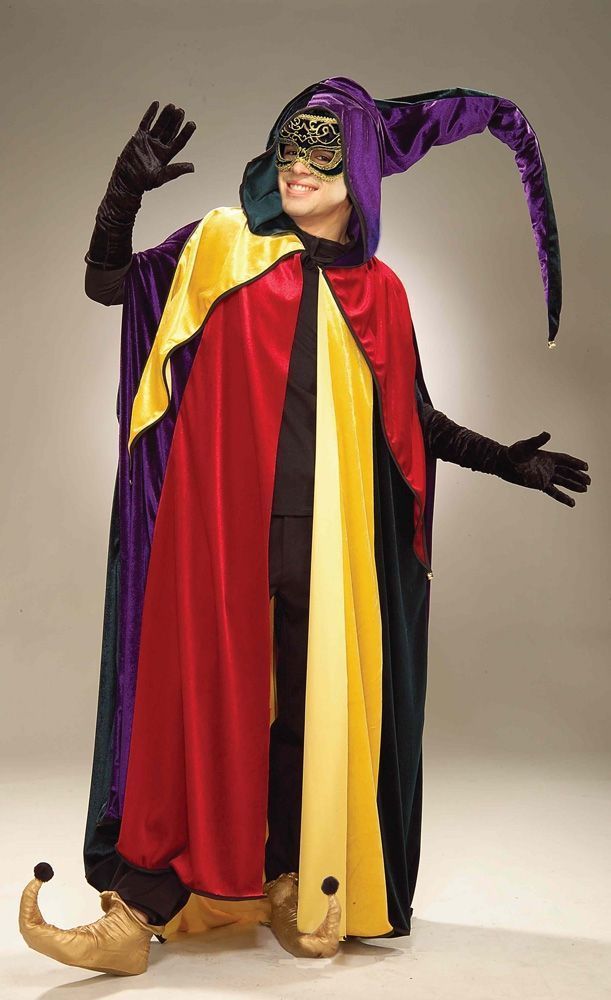 Одеяние шута включает в себя длинный плащ из атласного материала, выполненный в желтом, красном, черном и фиолетовом цветах, также имеется фиолетовый капюшон с длинным острым концом. Этот необычный костюм шута можно надеть на новогодние праздники и другие мероприятия.