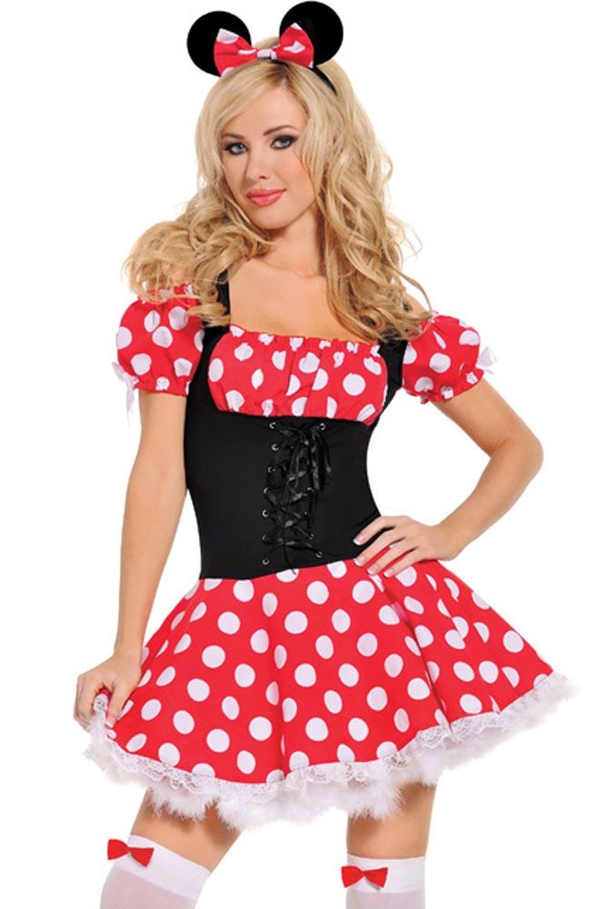 Костюм юной Минни состоит из платья, которое застегивается сзади на молнию, спереди удобная шнуровка, чтобы удачно подчеркнуть талию, такт же в комплектацию входит ободок с ушами и бантом.