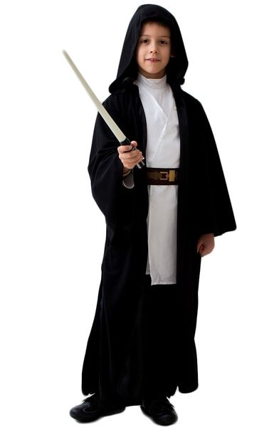 Детский черный костюм Джедая включает в себя длинный черный плащ с капюшоном, белую тунику, пояс, а также меч.