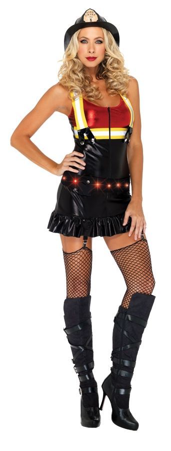Платье сладкой пожарной выполнен в чёрном цвете с красной и жёлтой вставкой. На платье имеется светящийся пояс. К этому костюму можно добавить каску, чулки и другие аксессуары, которые дополнят ваш образ. Имитация винила.