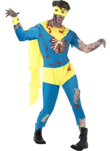 Костюм зомби супер героя выполнен в жёлто-голубом цвете. В комплект костюма входит комбинезон, маска на глаза, накладки на обувь и манжета. Такой супер герой вряд ли сможет кого-то спасти, если что только помочь избавиться от мучений.
