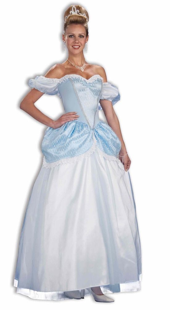 Платье принцессы Золушки - это изящное длинное бальное платье, выполненное в бело голубом цвете. Пышная длинная юбка белая, сверху она украшена голубыми лепестками с белой оборкой. На груди также имеется вышивка и белая оборка. Короткие рукава спущены и поэтому плечи открыты, что придает больше изящности.