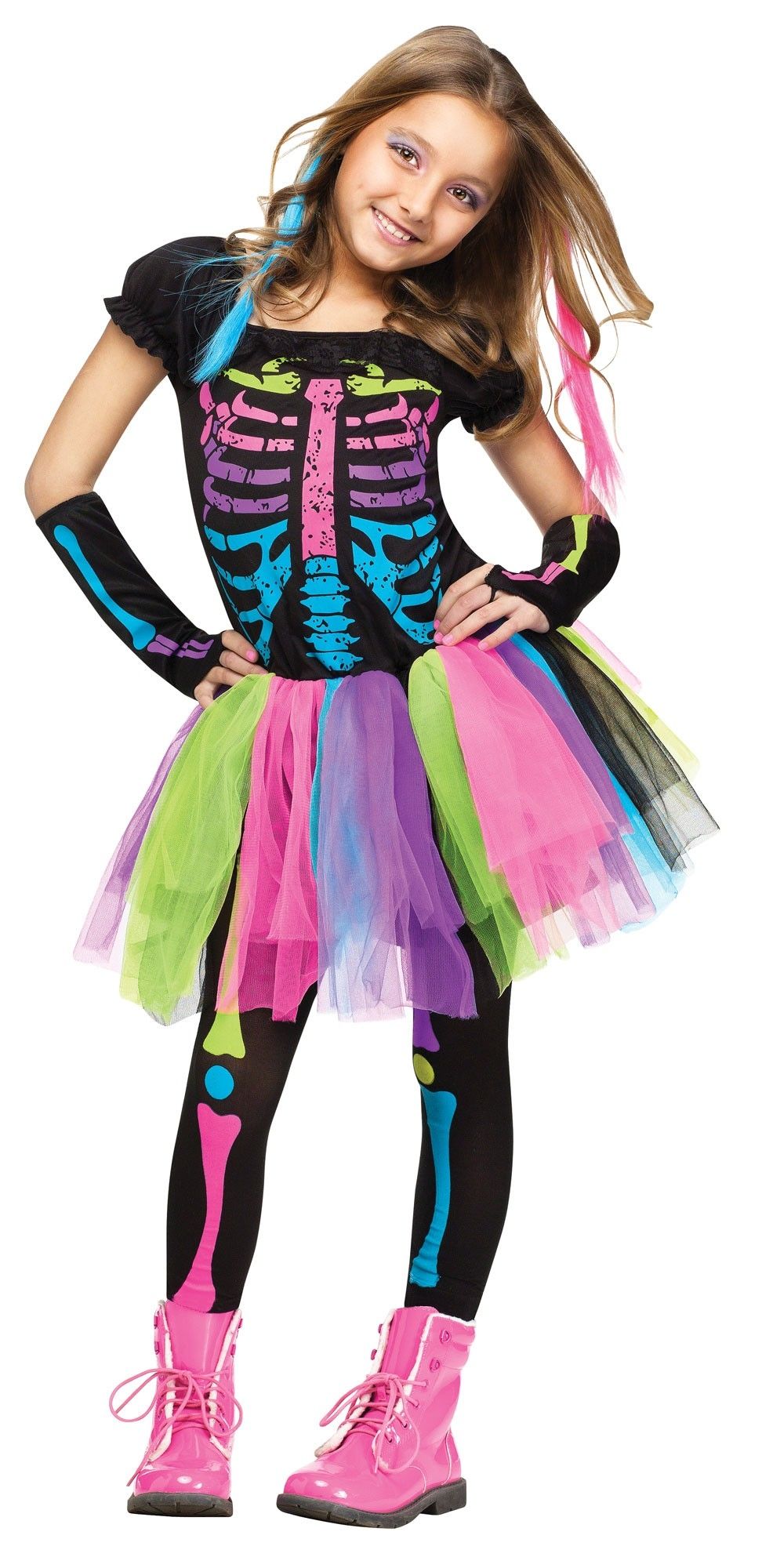 Детский костюм веселого Скелетика включает в себя легкое платье с черным топом с цветным принтом в виде костей грудной клетки и с цветной легкой юбкой. Также в комплект входят перчатки без пальцев с изображением костей и черные лосины с цветным косточками.