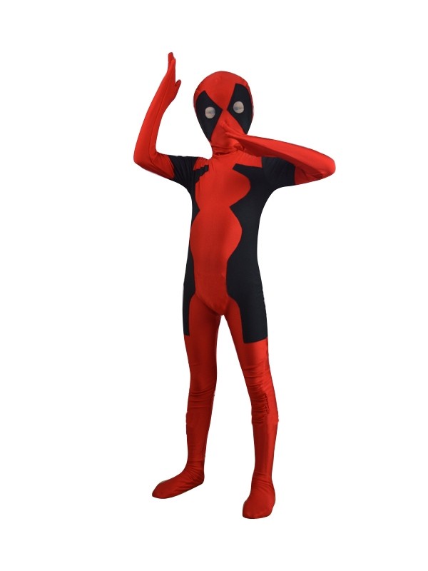 Детский костюм Зентай Дэд Пул - эластичный комбинезон, который покрывает все тело с головой. Костюм выполнен в красном цвете с черными вставками по боками и черными вставками на маске на уровне глаз.