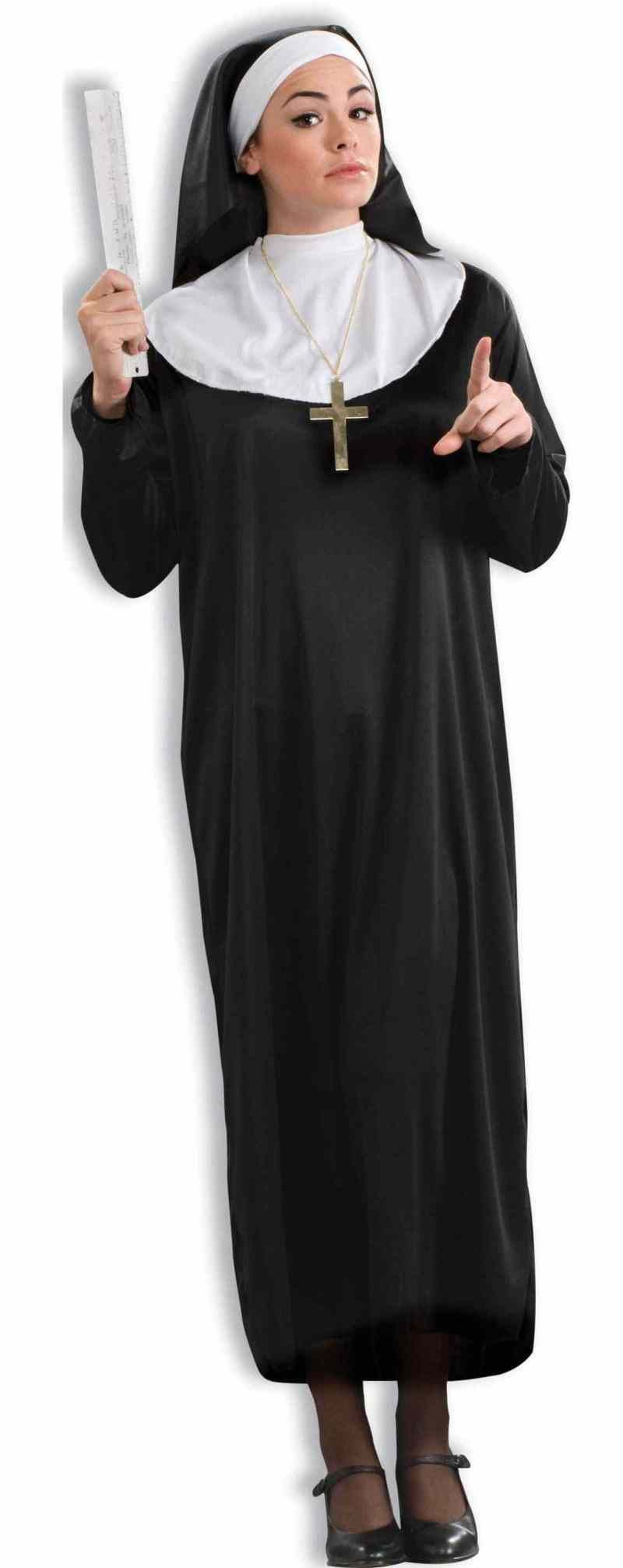 В комплект карнавального костюма строгой монашки входят платье, крест, головной убор и линейка.