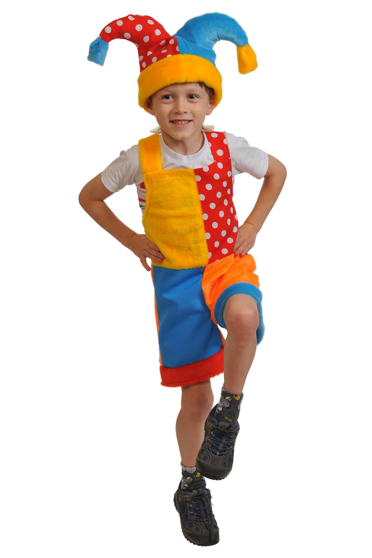 Плюшевый костюм Скомороха - яркий костюм, который включает в себя разноцветный плюшевый комбинезон с шортиками, а также яркий цветной головной убор с помпонами.
