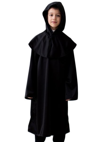 Детский костюм Монаха - черное одеяние, включающее в себя длинную рясу с длинными рукавами, а также капюшон с накидкой на плечи.