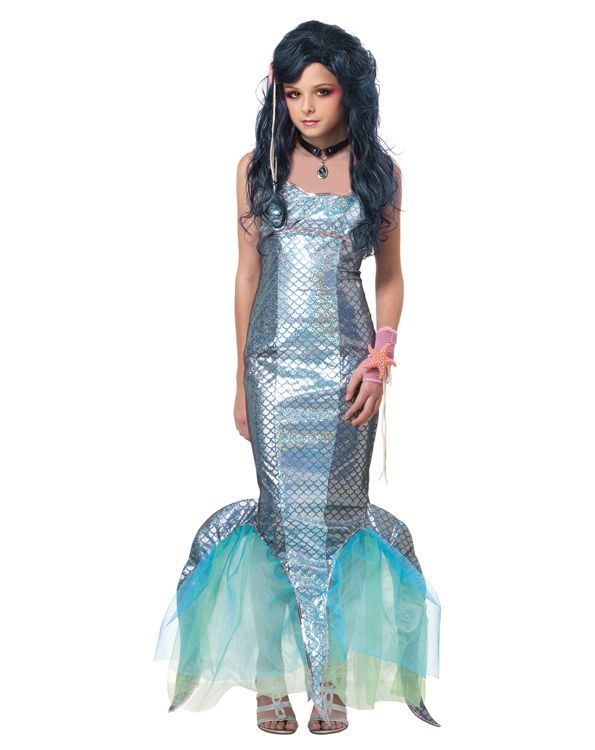 Подростковый костюм жемчужной русалки - это прекрасный костюм, который подойдет для изящных девочек. Костюм состоит из длинного платья, который сочетает в себе голубе оттенки, одной розовой короткой перчатки, колье, а также клипсы и морской звезды светло-оранжевого цвета.