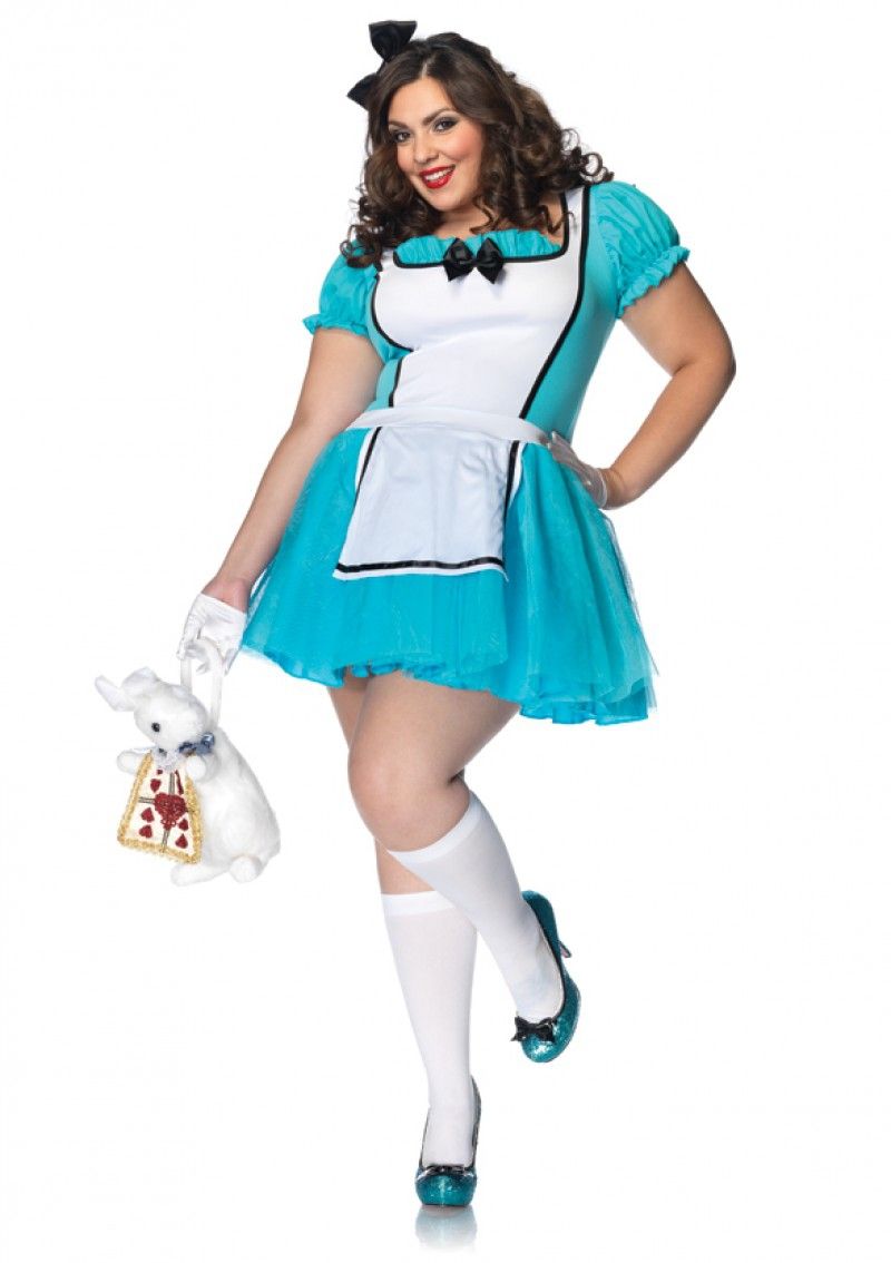 Костюм зачарованной Алисы XL включает в себя голубое платье с пышной юбкой и белым фартуком с черной отделкой и черным бантиком, а также в комплект входит бантик на голову.