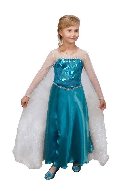 Костюм Эльзы Холодное Сердце - изящный костюм для маленьких принцесс. Костюм включает в себя длинное бирюзовое платье с блестящим отливом и дополнено сетчатой белой накидкой.