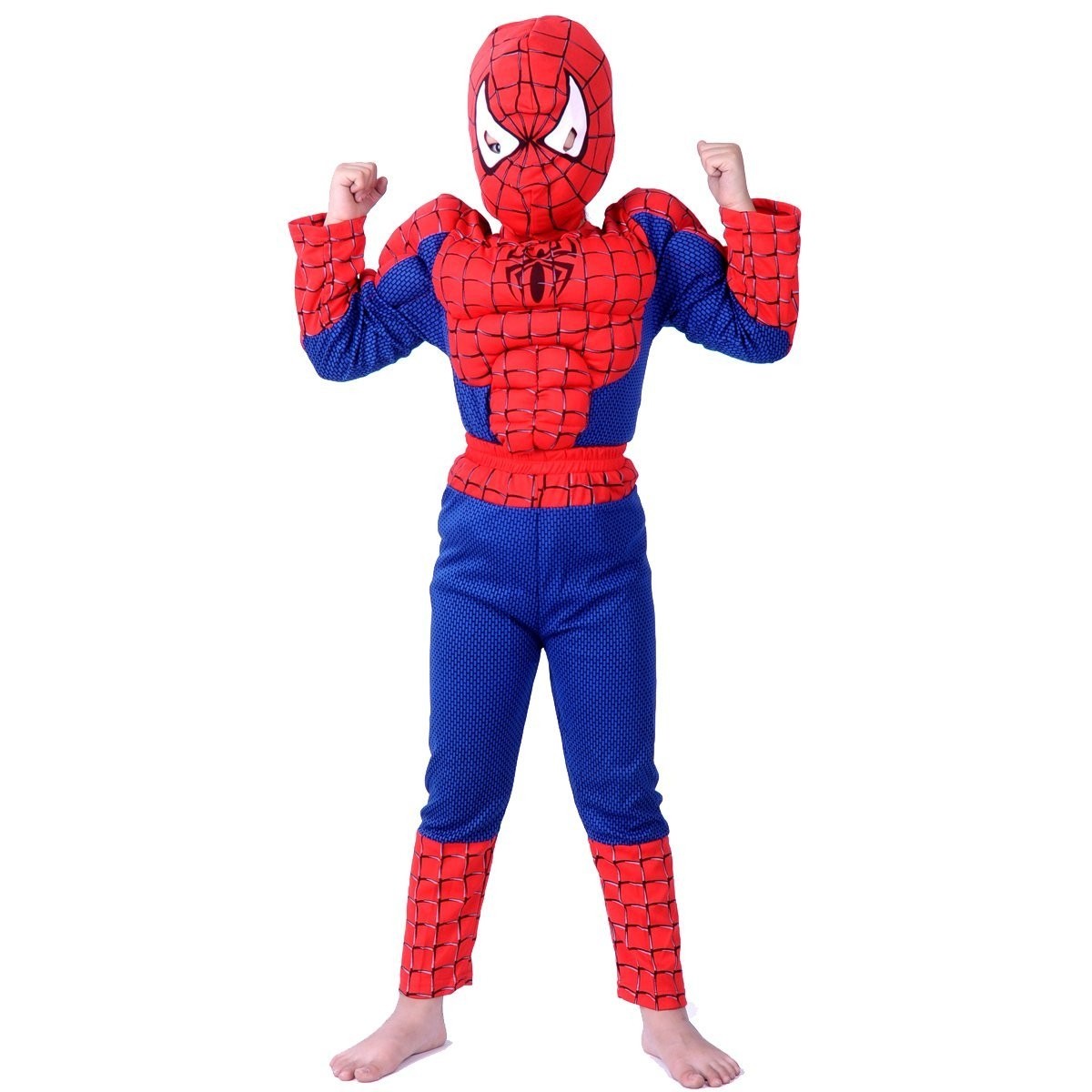 Детский костюм Человека Паука с мышцами выполнен в сине-красных цветах. В комплект входит футболка с длинными рукавами и накладными объемными мышцами. По центру ее дополняет черный паучок.Брюки синего цвета с красными вставками и маска с удобными прорезями для глаз завершают известный образ супер героя - Человека Паука.