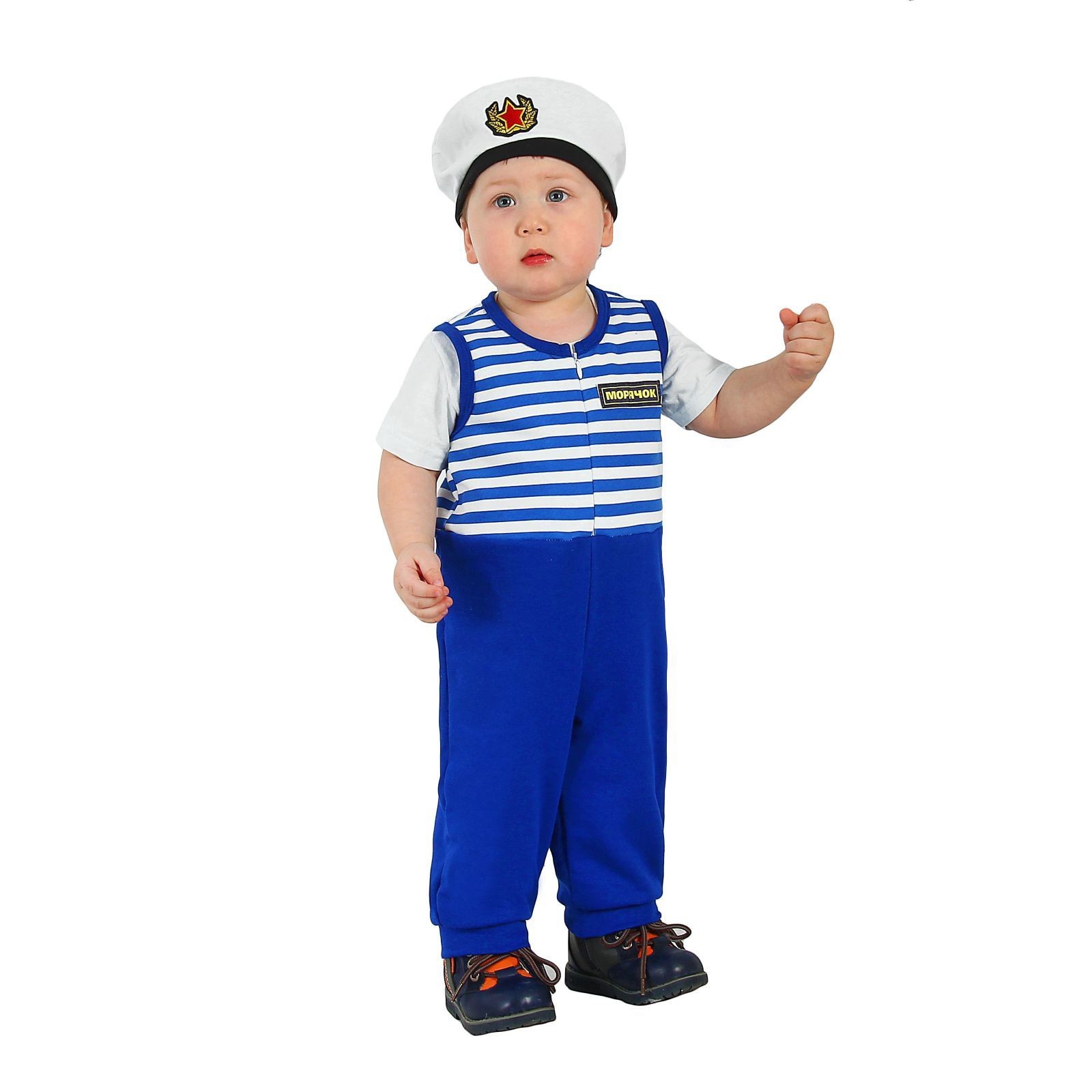 Костюм малыша-морячка - детский костюм для маленьких любителей моря. В комплект входит комбинезон с синими брючками и полосатым верхом. Его дополняет нашивка. Также в комплект входит белая бескозырка с нашивкой.