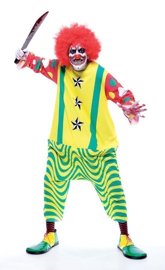 Комбинезон Клоуна выполнен в ярких цветах. К нему прилагается надувное кольцо, для того чтобы создать видимость большого живота. К комбинезону можно добавить маску, грим, парик и прочие аксессуары. Вы можете стать кровожадным клоуном, а может быть просто весёлым. Костюм подходит как для девушек, так и для мужчин.