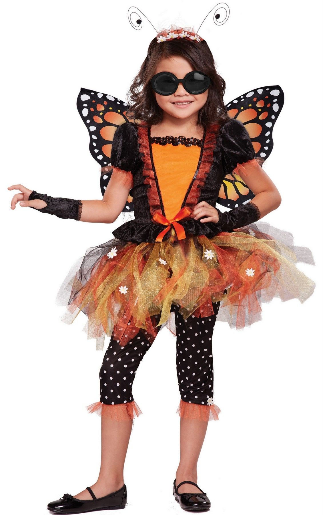 Костюм юной бабочки включает в себя топ с кружевной отделкой, трехцветную воздушную юбку и перчатки, крылья, ободок с рожками и леггинсы. Все это позволит порхать от радости на любом празднике. В комплектацию костюма обувь не входит.
