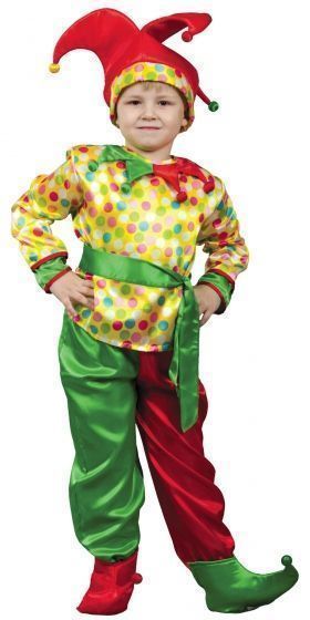 Костюм озорного Петрушки выполнен в ярких цветах. В костюм входят брюки красно-зеленого цвета, желтая рубашка в горох с зеленым поясом, разноцветные ботинки с острыми носами, а также красный трехконечный колпак с маленькими помпончиками.