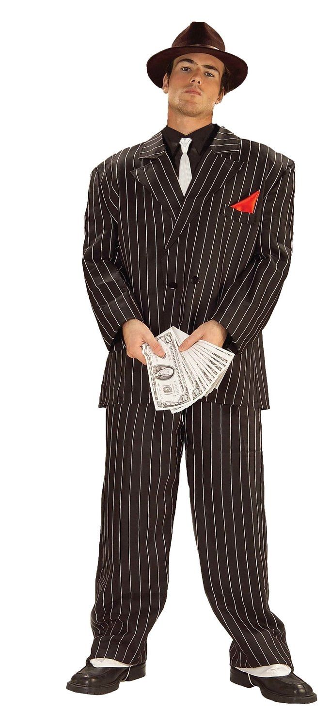 Костюм чикагского гангстера выполнен черного материала в тонкую белую полоску. В комплект входит пиджак, а также брюки. Дополнить образ можно шляпой и прочими аксессуарами.