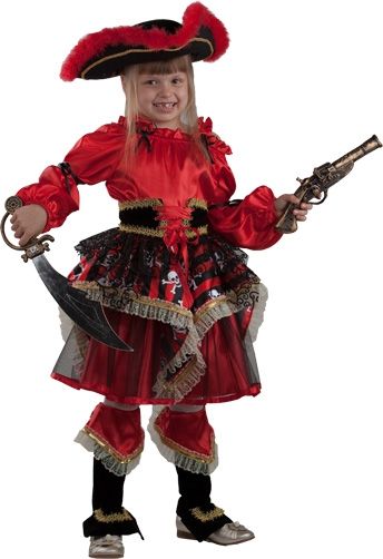 Детский костюм пиратки-озорницы включает в себя красную блузу с маленькими чёрными бантиками, юбку, пояс, накладки на обувь, шикарную чёрную шляпу с красной отделкой, а также саблю и мушкет. Этот костюм понравится энергичным и весёлым девочкам. Такой наряд можно надеть на Новогодний утренник и на любой другой праздник.