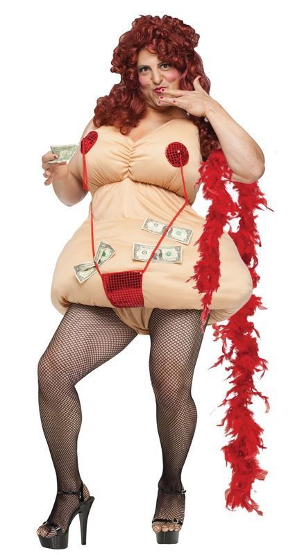 Толстушка Джина в мини-бикини не даст соскучиться. В комплект входит платье которое полнит с приклеенными к нему купюрами и блестящими стрингами и накладками на соски и красное боа из перьев.