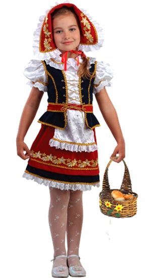 Костюм юной Красной шапочки из всеми любимой сказки отлично подойдет для постановок в детском театре или иных веселых событий. В нем есть все необходимое для создания классического образа Красной Шапочки: белая блузка, зеленая жилетка на шнуровке, красная юбка декорированная по краю желтым орнаментом и конечно же красная шапочка.