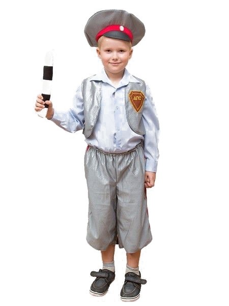 Костюм маленького ГАИшника - серый костюм, в комплекте которого имеются штаны, жилетка, фуражка с красной полоской, а также жезл.
