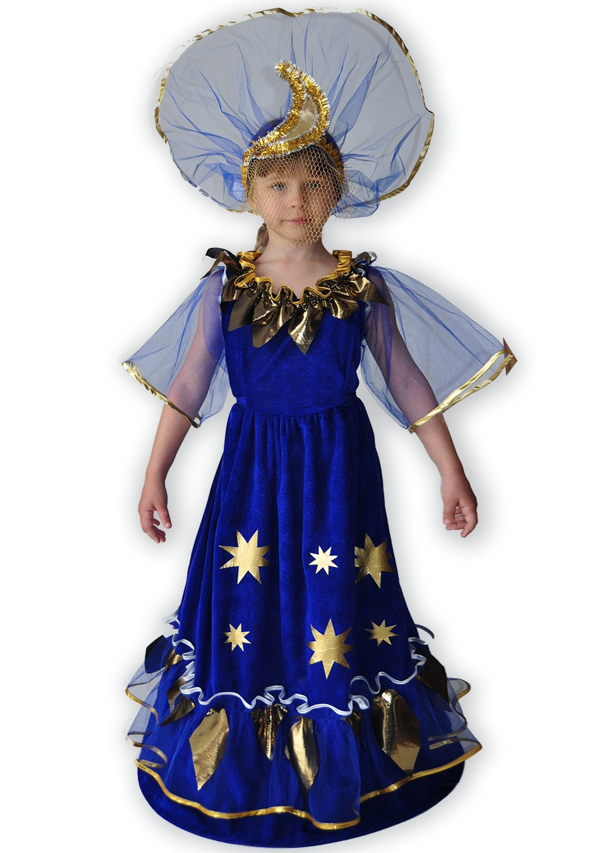 Детский костюм Звездная ночь - изящный наряд, который включает в себя длинное бархатное платье, выполненное в темно-синем цвете и украшено золотистыми звездами. К платью прилагается объемный головной убор, украшенный месяцем из золотистой мишуры и золотистой вуалью, а также сетчатые широкие нарукавники.