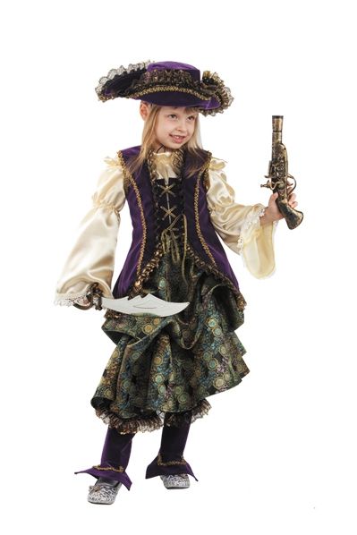 Детский костюм капитанши пиратов. Костюм отлично подойдет для озорных девченок любящих покомандовать. В комплекте:камзол,юбка,рубаха,накладки на сапоги, шляпа, меч, пистолет.