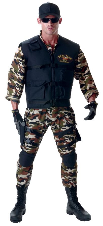Костюм Морского котика включает в себя камуфляжный комбинезон, жилет с вышитой эмблемой, кобуру, сумку на бедро, наколенники и кепку. Такой костюм прекрасно подойдёт для тематических праздников и вечеринок. Свой образ вы можете дополнить оружием и другими подходящими аксессуарами.