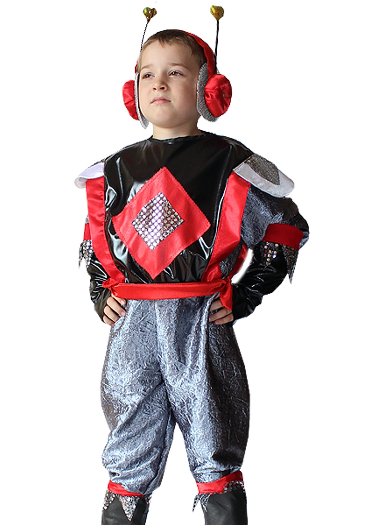 Детский костюм космического жителя выполнен в красно-серебряном цвете. Костюм подойдет для мальчишек, которые увлекаются Космосом.