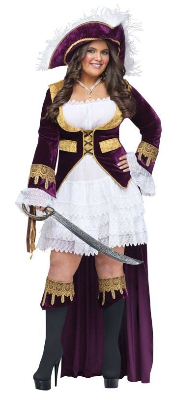 Костюм карибской королевы XL идеальный выбор для пухленьких девушек. В этом костюме вы будете выглядеть величественно и грозно. В комплекте имеется кружевное платье белого цвета, бархатный плащ, шляпа и накладки на сапоги. Костюм выполнен в сиреневом цвете с золотой вышивкой - эти цвета прекрасно сочетаются между собой и говорят о богатстве и величии.