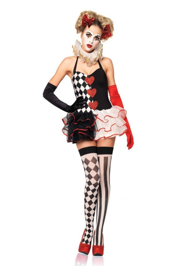 Костюм милашка Арлекин включает в себя короткое платье с многослойной юбочкой. Одна часть платья выполнена в черном цвете, другая в белом. На груди платье украшено красными сердечками. К нему также прилагается белый воротничок.