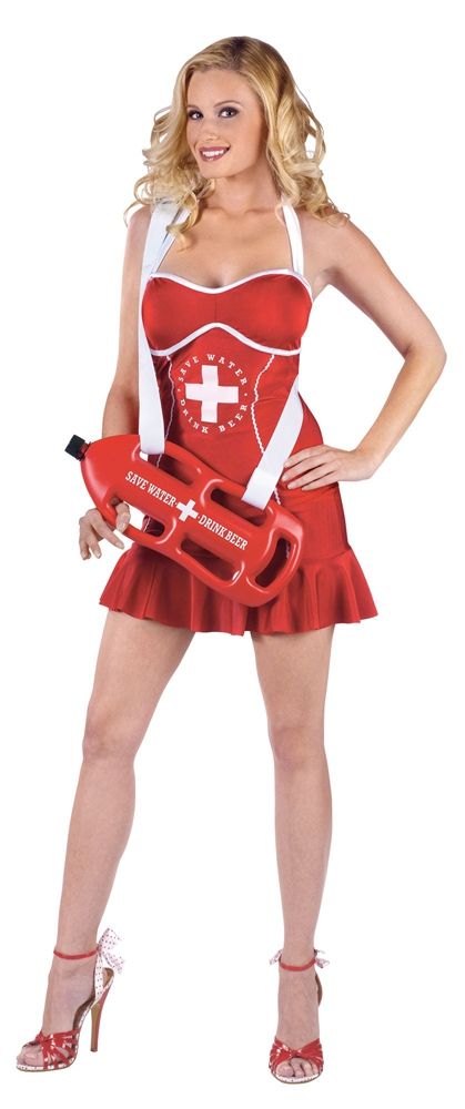 Костюм секси спасательницы выполнен в красном цвете с белой отделкой. В костюме имеется короткое платье с плиссированным подолом, а также красная фляжка на белом ремне, которая предназначена для различных алкогольных и безалкогольных напитков.