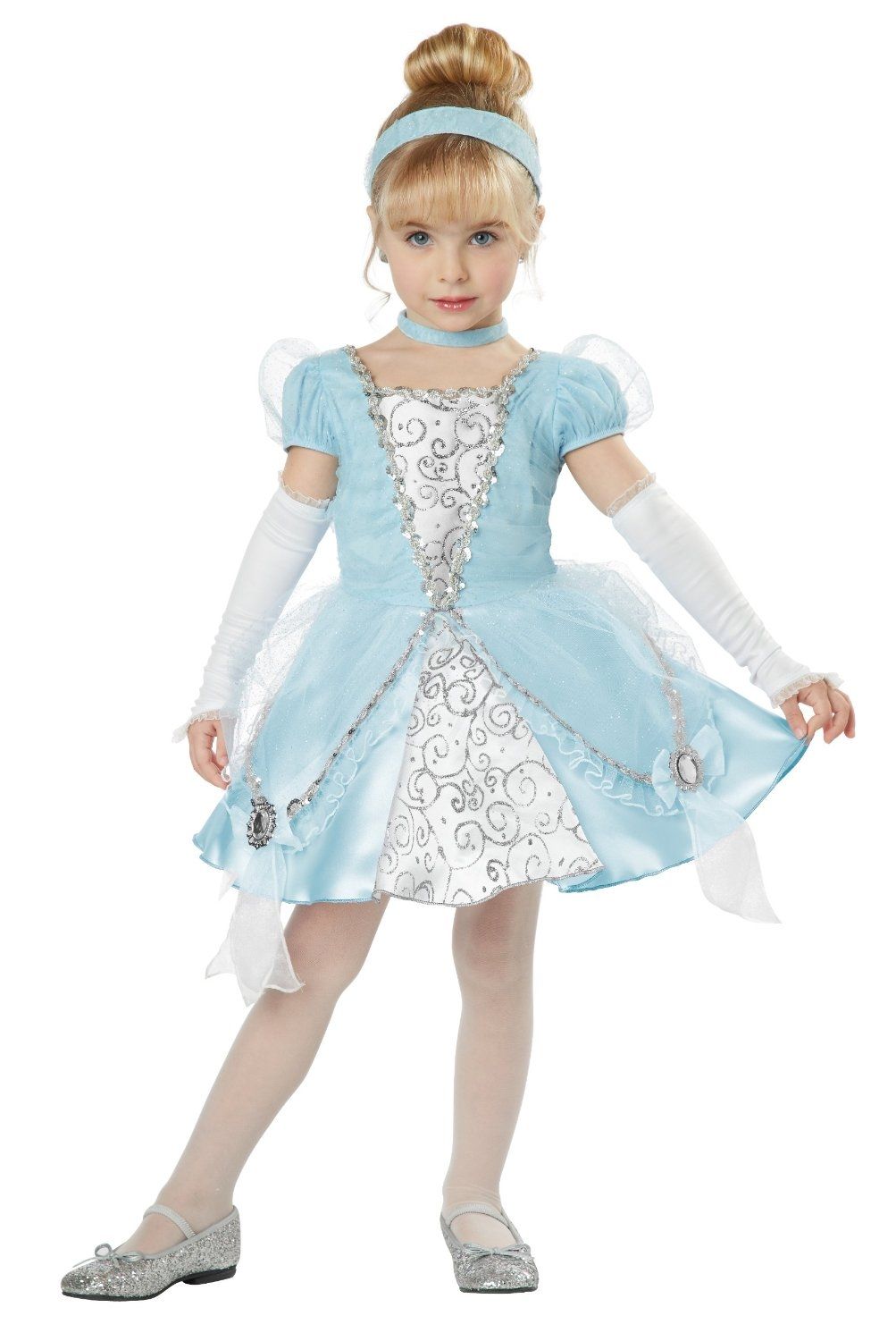 Этот роскошный костюм милой Золушки превратит вашу малышку в сказочную принцессу. Праздничное нежно-голубое платье с серебристой отделкой и прозрачной тканью на подоле декорировано имитацией драгоценных камней. В комплекте с платьем идут длинные перчатки, повязка на голову и шею.