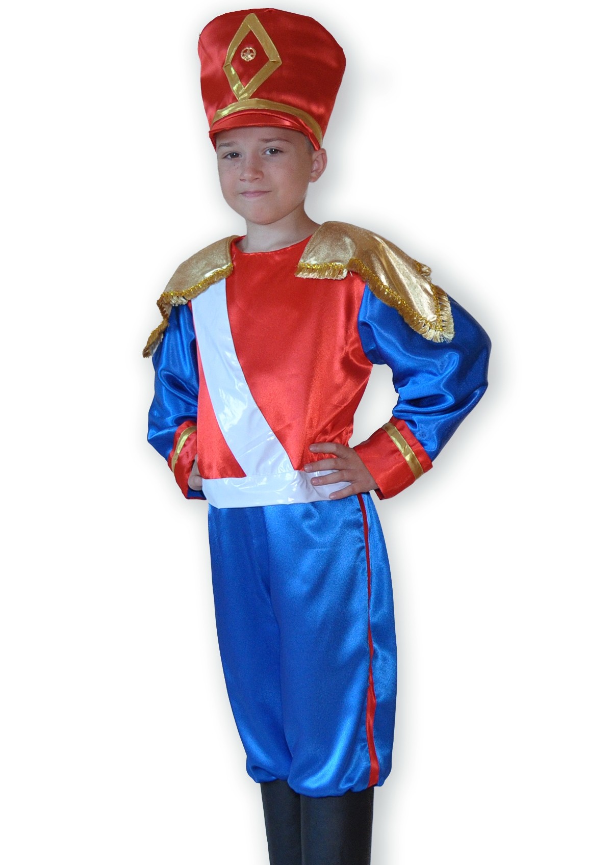 Детский костюм гвардейца выполнен из атласного материала. В комплект входит комбинезон сине-красного цвета, который имитирует брюки и пиджак. К комбинезону крепятся черные накладки на обувь, которые имитируют сапоги. Также костюм дополняет красный кивер с золотистой отделкой.
