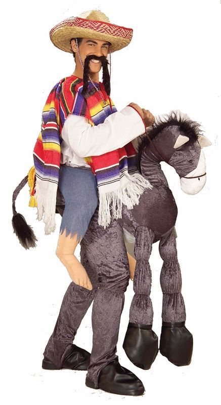 Костюм амигоса включает в себя шляпу, усы, пончо и брюки с прикреплённым к ним ослом. В таком костюме не страшны никакие расстояния, можно смело отправляться в путешествие.