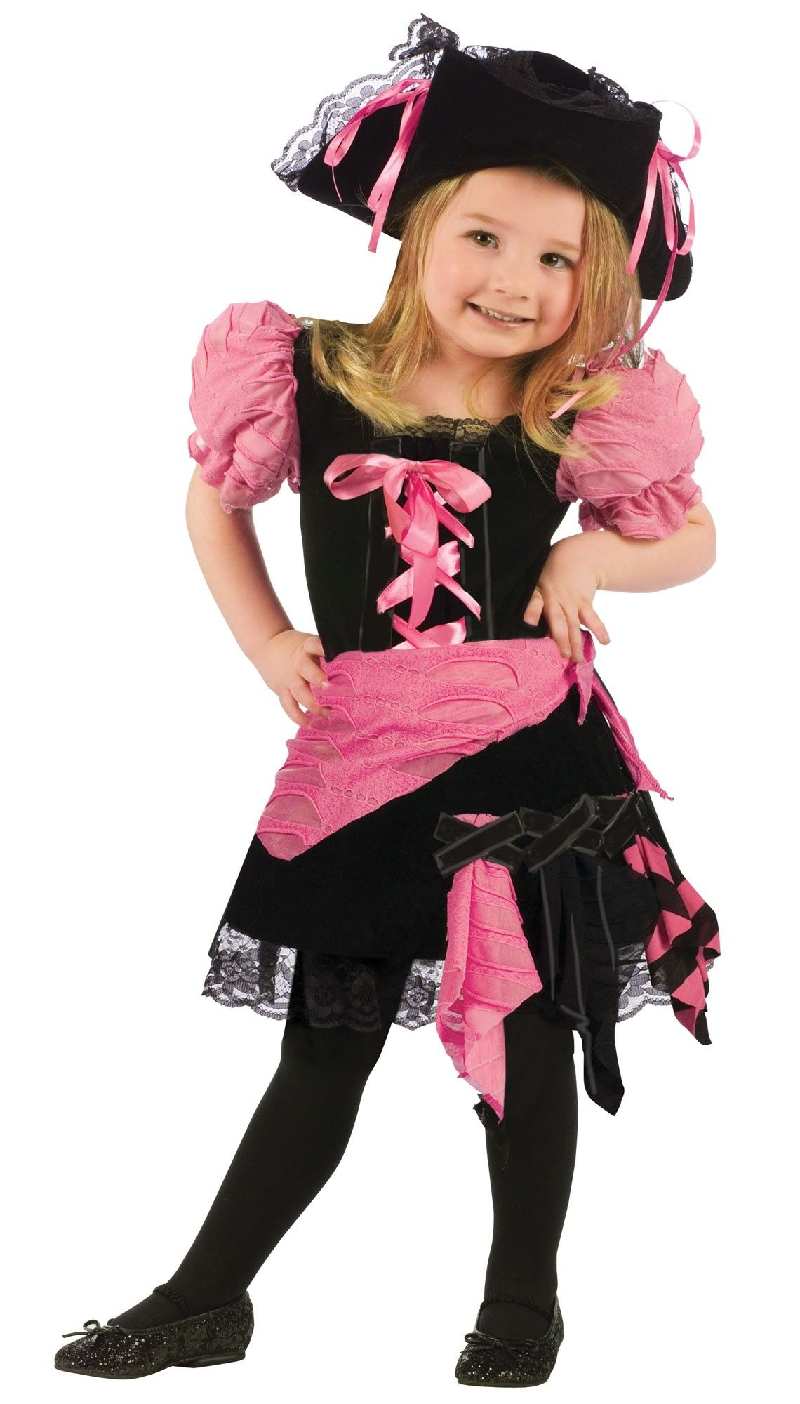 Детский костюм Панк пиратки выполнен в черном цвете с розовыми акцентами. Костюм состоит из черного платья, подол которого выполнен из кружевного материала. На груди имеется розовая атласная шнуровка, рукава-фонарики выполнены в розовом цвете. К платью прилагается розовый пояс-платок и шикарная пиратская шляпа, украшенная кружевом и розовыми бантиками.