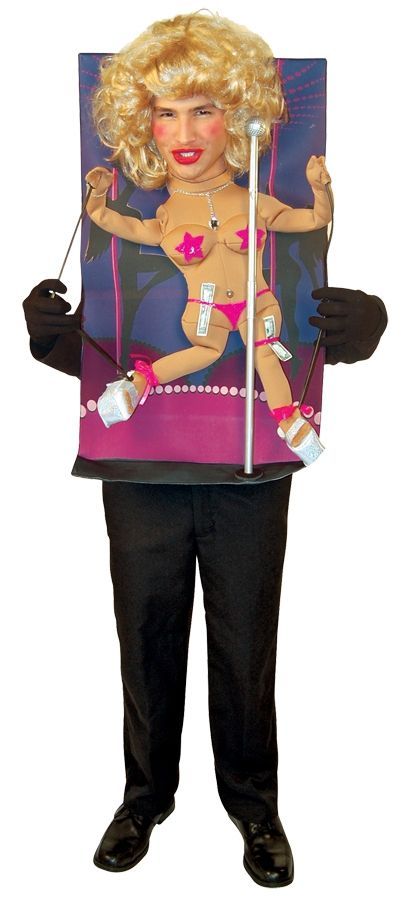 Костюм Анимированная стриптизёрша представляет собой полотно, которое крепится к телу. На полотне расположена полуголая девушка, а также имеется отверстие для вашей головы. К рукам и ногам прикреплены палочки с помощью которых можно управлять движениями девушки.