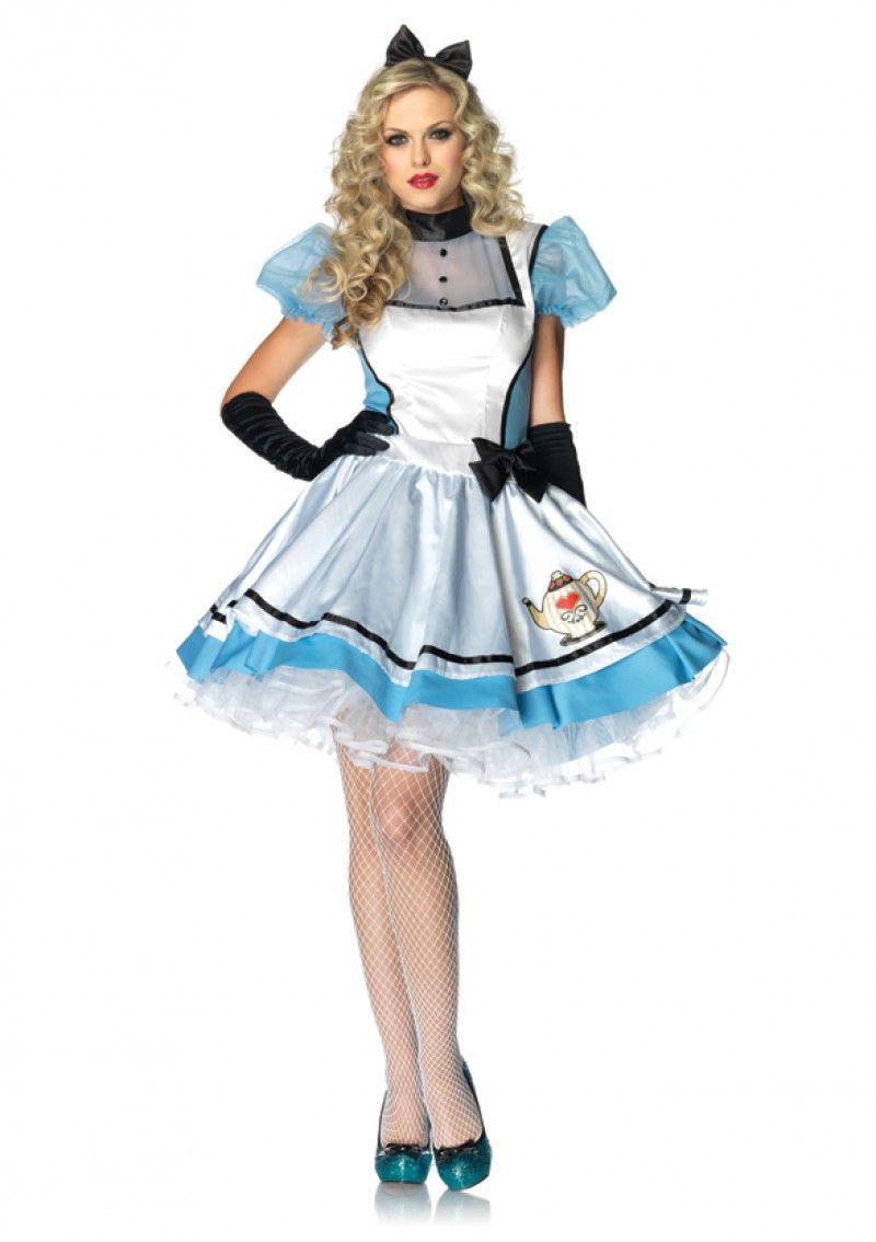 Костюм Чаепитие Алисы состоит из пышного голубого платьица с рукавами-фонариками и воротничком под горлышко. Платье украшено белым прикрепленным фартуком с изображением чайника и прикрепленным черными бантиком. К платью также прилагается ободок с бантиком.