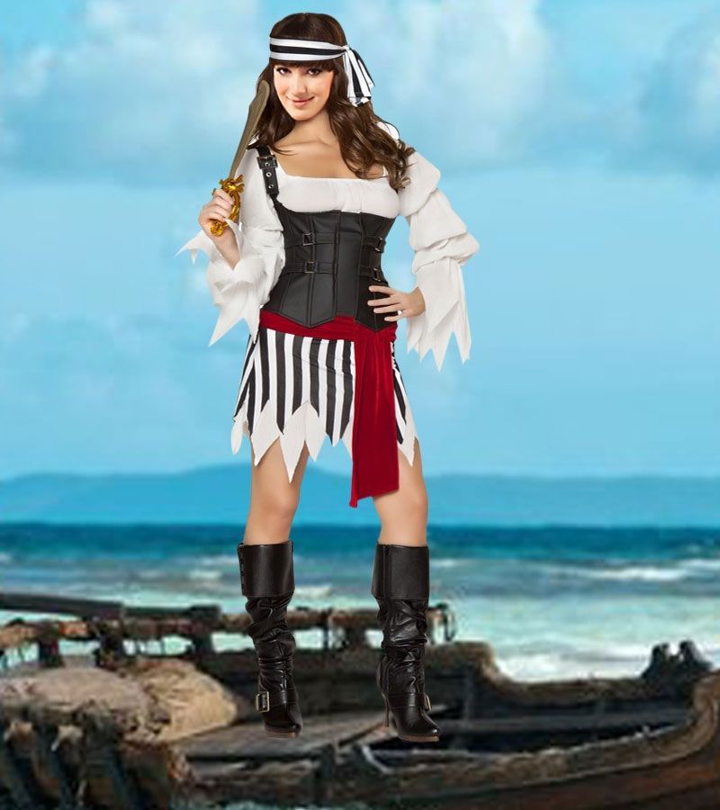 Костюм веселый пиратки включает в себя белый топ с длинными рваными рукавами, двухслойную юбку в черно-белую полосу, красный пояс, черный корсет на бретельках и шнуровке сзади, повязку на голову. Встречным короблям будет совсем не весело встретить такую пиратку.