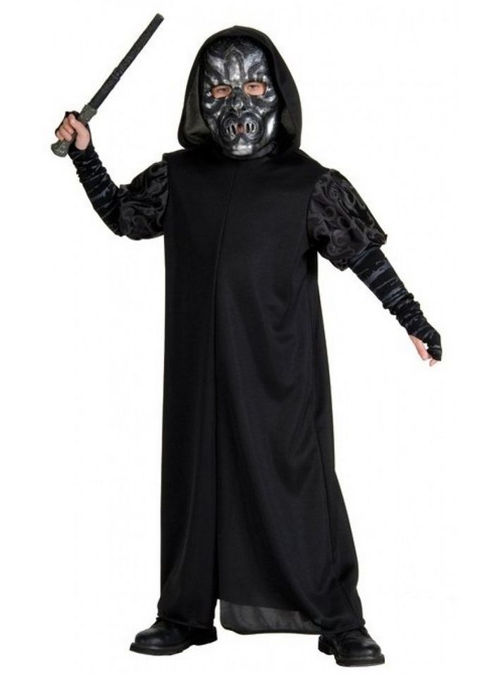 Детский костюм Пожирателя Смерти - одного из темных волшебников из Гарри Поттера. Костюм включает в себя длинную черную мантию с капюшоном, а также маску, которая закрывает все лицо.