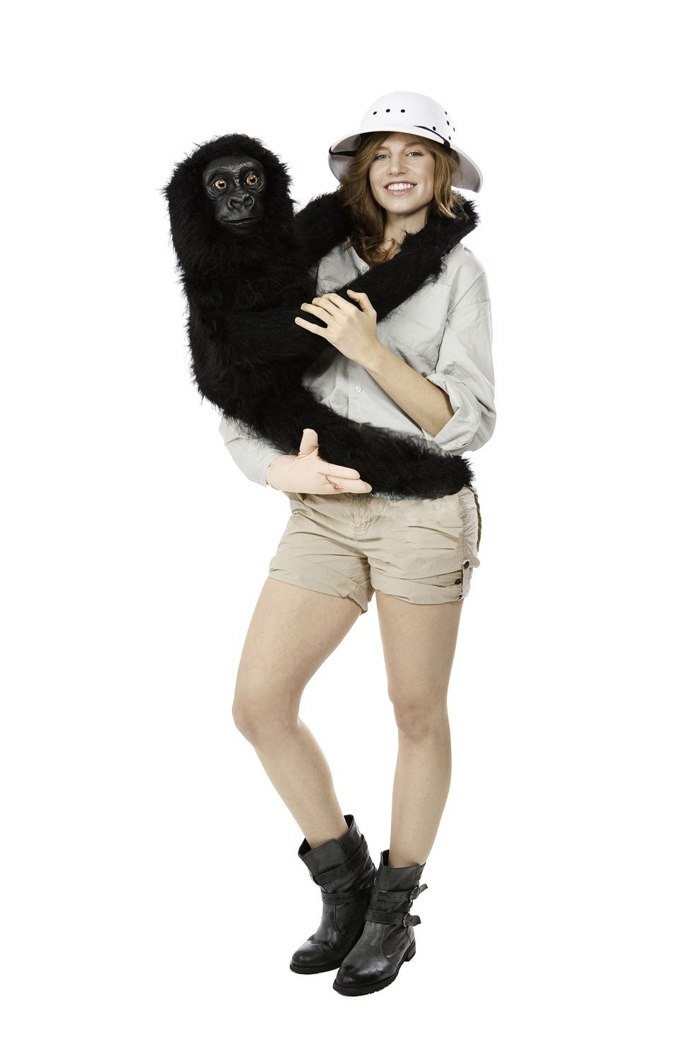 Малышка горилла Ручная игрушка - это мягкая игрушка, которую вы можете оживить своей рукой. Эта игрушка будто обнимает вас, а вы ее, в то время как ваша рука управляет ее движениями. Такая игрушка идеальна для костюмов гидов, исследователей и подобных образов.