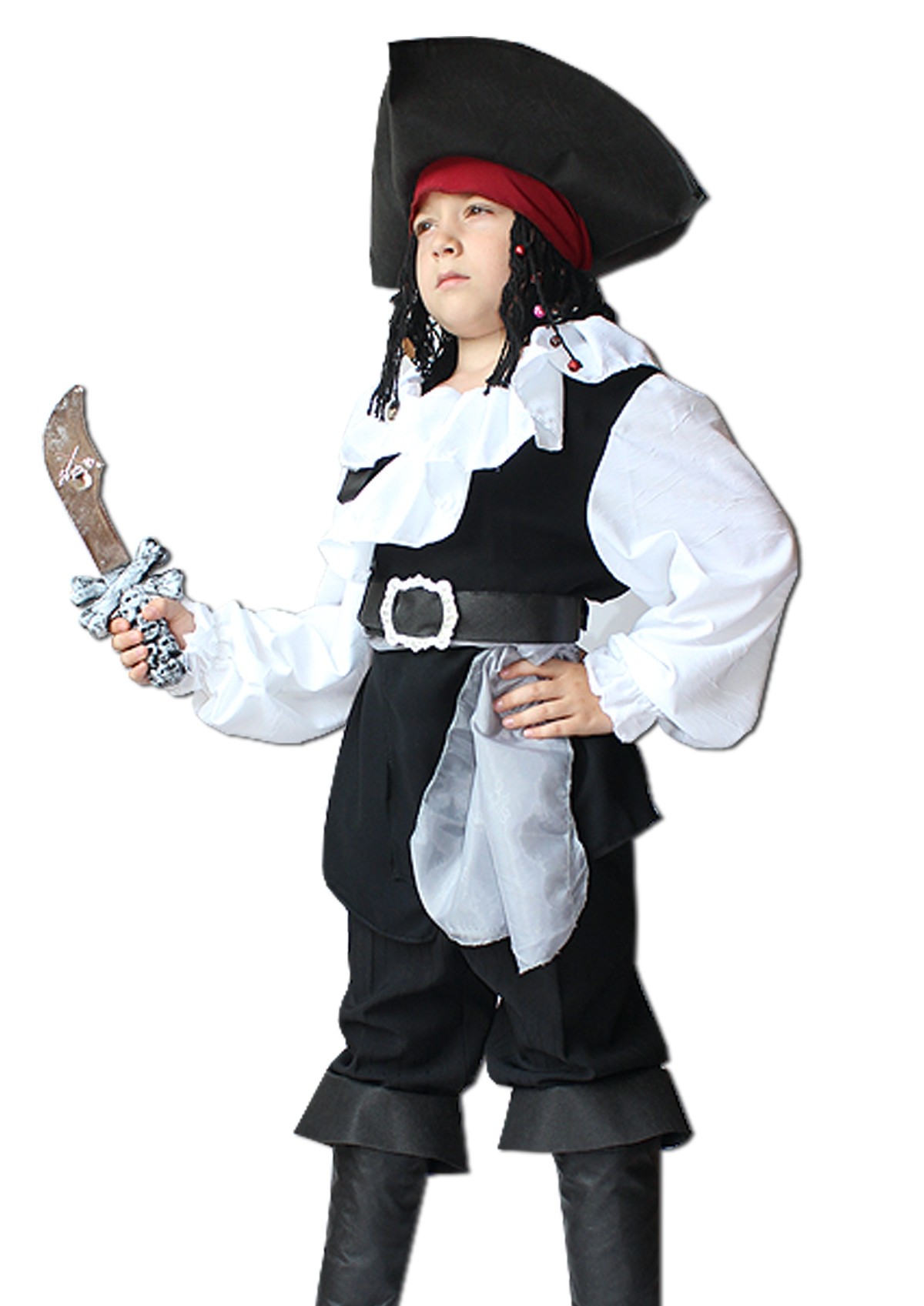 Детский костюм Джека Воробья представляет собой образ знаменитого пирата из фильма "Пираты Карибского моря". Костюм включает в себя шляпу, красную бандану с пришитыми черными дредами, черный жилет с вшитой белой рубахой, черный пояс, а также черные накладки на обувь.