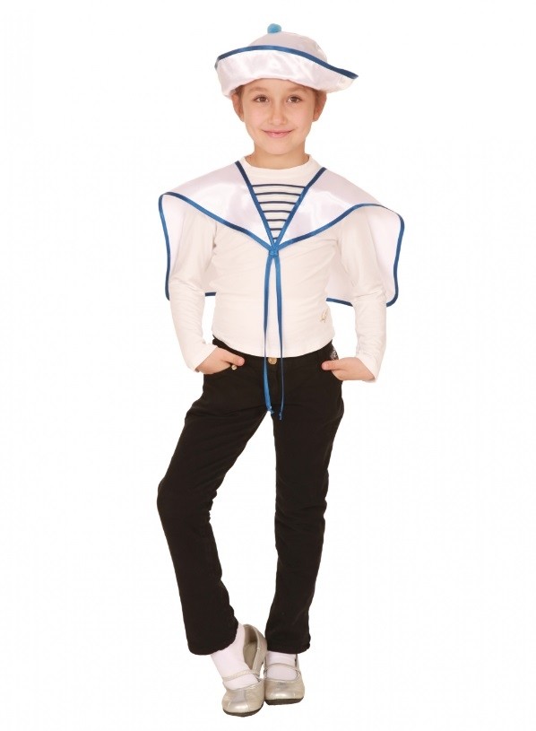Комплект морячка выполнен из атласного материала. В комплект входит белый воротничок с синей отделкой, а также белая шапочка моряка с синей отделкой и небольшим помпоном на макушке.
