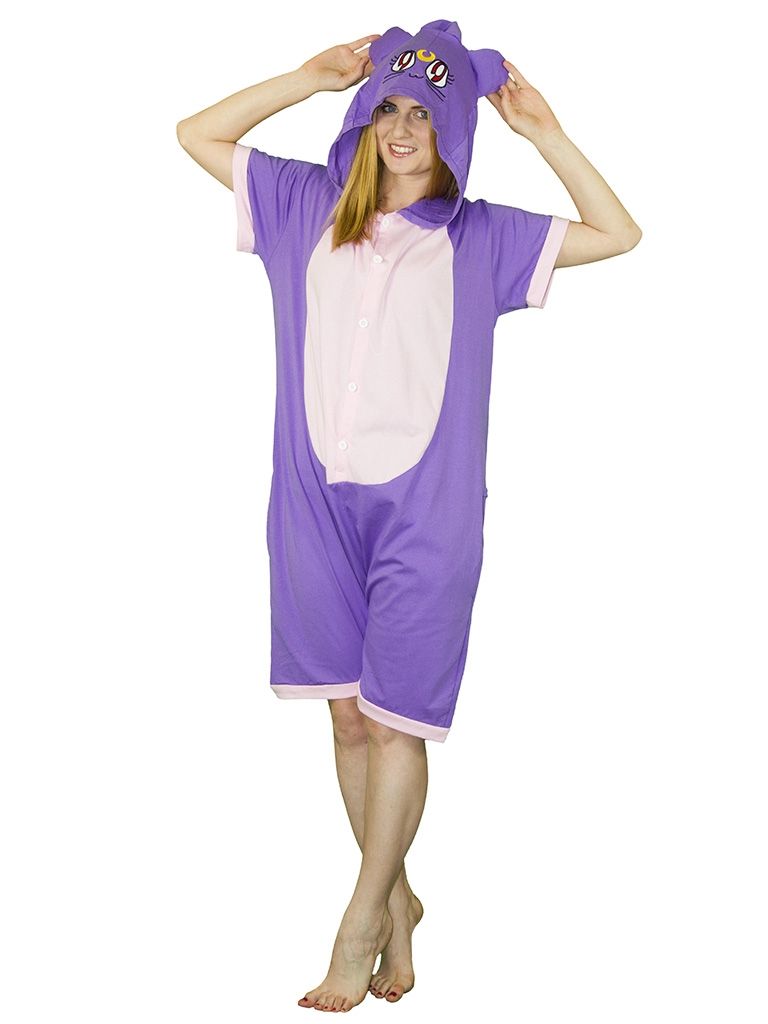 Пижама-кигуруми Кошечка с шортиками выполнена в фиолетовом цвете с бледно-розовой вставкой спереди. Кигуруми с капюшоном с мордочкой и ушками кошечки. Пижама-кигуруми с коротким рукавом и с застежкой на пуговицах.