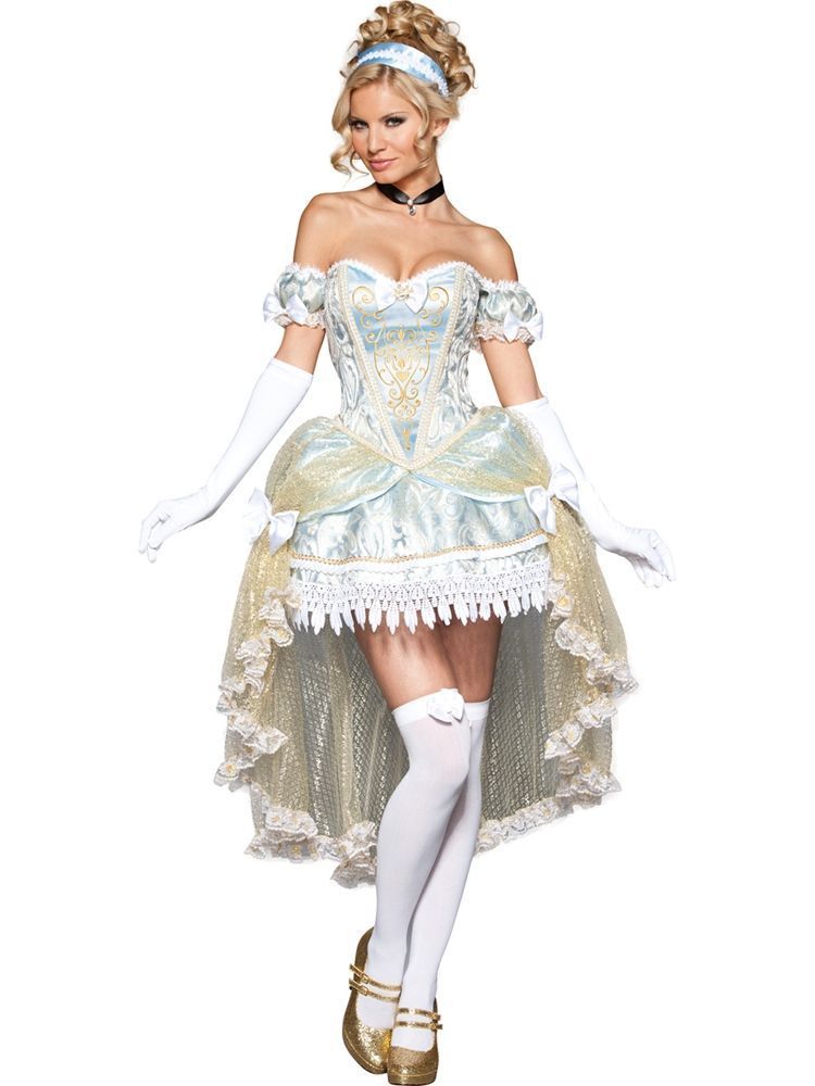 Костюм страстной принцессы Золушки - это изящный наряд, который подойдет для новогодних праздников. В комплекте костюма имеется платье, выполненное в нежно голубом цвете и украшено золотой вышивкой и белыми бантиками. Рукава-фонарики, сзади белая шнуровка. Короткая пышная юбочка украшена длинным шлейфом из золотой тюли. Также в костюм входит черное колье, белые перчатки и атласный голубой головной убор.
